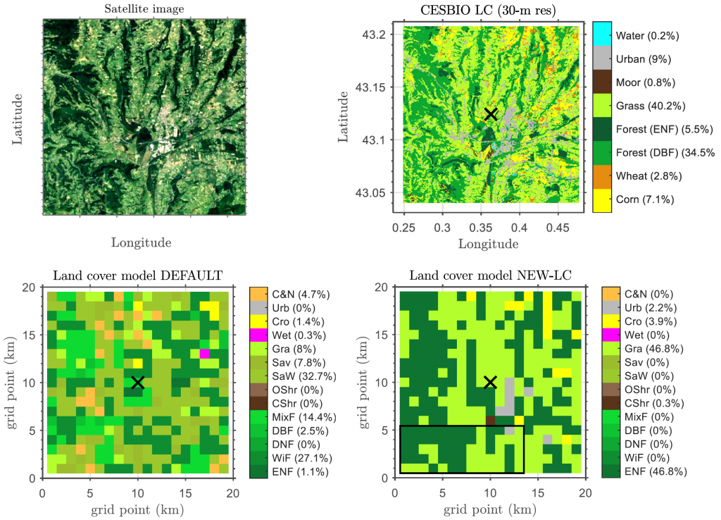 The water and energy transfers at the interface between the Earth’s surface and the atmosphere should be correctly simulated in numerical weather and climate models. This implies the need for a realistic and accurate representation of land cover (LC), including appropriate parameters for each vegetation type. In some cases, the lack of information and crude representation of the surface leads to errors in the simulation of soil and atmospheric variables. This work investigates the ability of the Weather Research and Forecasting (WRF) model to simulate surface heat fluxes in a heterogeneous area of southern France, using several possibilities for the surface representation. In the control experiments, we used the default LC database in WRF, which differed significantly from the actual LC. In addition, sub-grid variability was not considered since the model uses, by default, only the surface information from the dominant LC category in each pixel (dominant approach). To improve this surface simplification, we designed three new interconnected numerical experiments with four widely used land-surface models (LSMs) in WRF. The first one consisted of using a more realistic and higher-resolution LC dataset over the area of analysis. The second experiment aimed at investigating the effect of using a mosaic approach, where 30-m sub-grid surface information was used to calculate the final grid fluxes, based on weighted averages from values obtained for each LC category. Finally, in the third experiment, we increased the model stomatal conductance for conifer forests, due to the large fluxes errors associated with this vegetation type in some LSMs. The simulations were evaluated with gridded area-averaged fluxes calculated from five tower measurements obtained during the Boundary Layer Late Afternoon and Sunset Turbulence (BLLAST) field campaign. The results from the experiments differed depending on the LSM and displayed a high dependency of the simulated fluxes on the specific LC definition within the grid cell, an effect that was enhanced with the dominant approach. The simulation of the fluxes improved using the more realistic LC dataset except for the LSMs that included extreme surface parameters for the coniferous forest. The mosaic approach produced fluxes more like reality and served to improve, especially, the latent heat flux simulation of each grid cell. Therefore, our findings stress the need to include an accurate surface representation in the model, including soil and vegetation sub-grid information with updated surface parameters for some vegetation types, as well as seasonal and man-made changes. This will improve the modelled heat fluxes and ultimately yield more realistic atmospheric processes in the model.