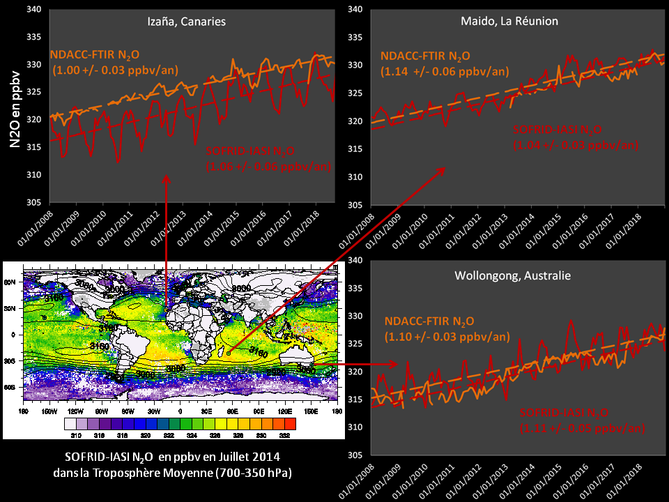 La chaîne de traitement SOFRID, développée au LAERO depuis 2009 pour l’Ozone (O3) et le monoxyde de carbone (CO) a été adaptée pour déterminer les concentrations troposphériques de N2O à partir des données du sondeur spatial infrarouge IASI (CNES) à bord ds plateformes Metop (EUMETSAT). Pour la première fois, les données de ce sondeur hyperspectral ont documenté les dynamiques spatiales et saisonnières ainsi que les tendances d’accumulation de ce GES à l’échelle planétaire sur plus d’une décennie. Ces nouvelles données SOFRID-N2O ont été validées par les observations des spectromètres infrarouges (FTIR) de 12 stations du réseau de détection du changement de la composition atmosphérique (NDACC). En particulier, le sondeur IASI et les spectromètres FTIR produisent des tendances comparables dans la moyenne troposphère (~ 1.05 ppbv/an). Ce travail préliminaire ouvre donc des perspectives pour améliorer la cartographie des sources de ce GES. Des collaborations ont été mises en place pour l’exploitation de ces données avec le CESBIO (surfaces continentales/agriculture) et le CNRM (océans).