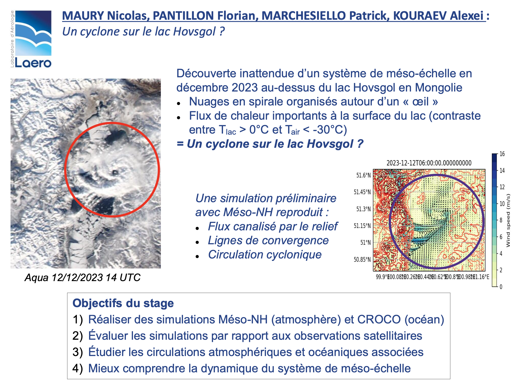 Le stage porte sur l’étude de nuages au-dessus du lac Hovsgol et potentiellement au-dessus d’autres lacs. Des simulations numériques seront réalisées avec les modèles de la communauté de recherche française Méso-NH pour l’atmosphère et CROCO pour l’océan.