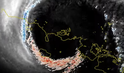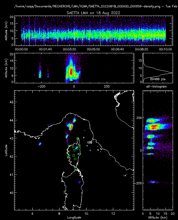 Densité des sources VHF (gamme 60-66 MHz) émises par les éclairs lors de la tempête du 18 août 2022 par séquences de 10 minutes. Cadre du haut: altitude des sources […]