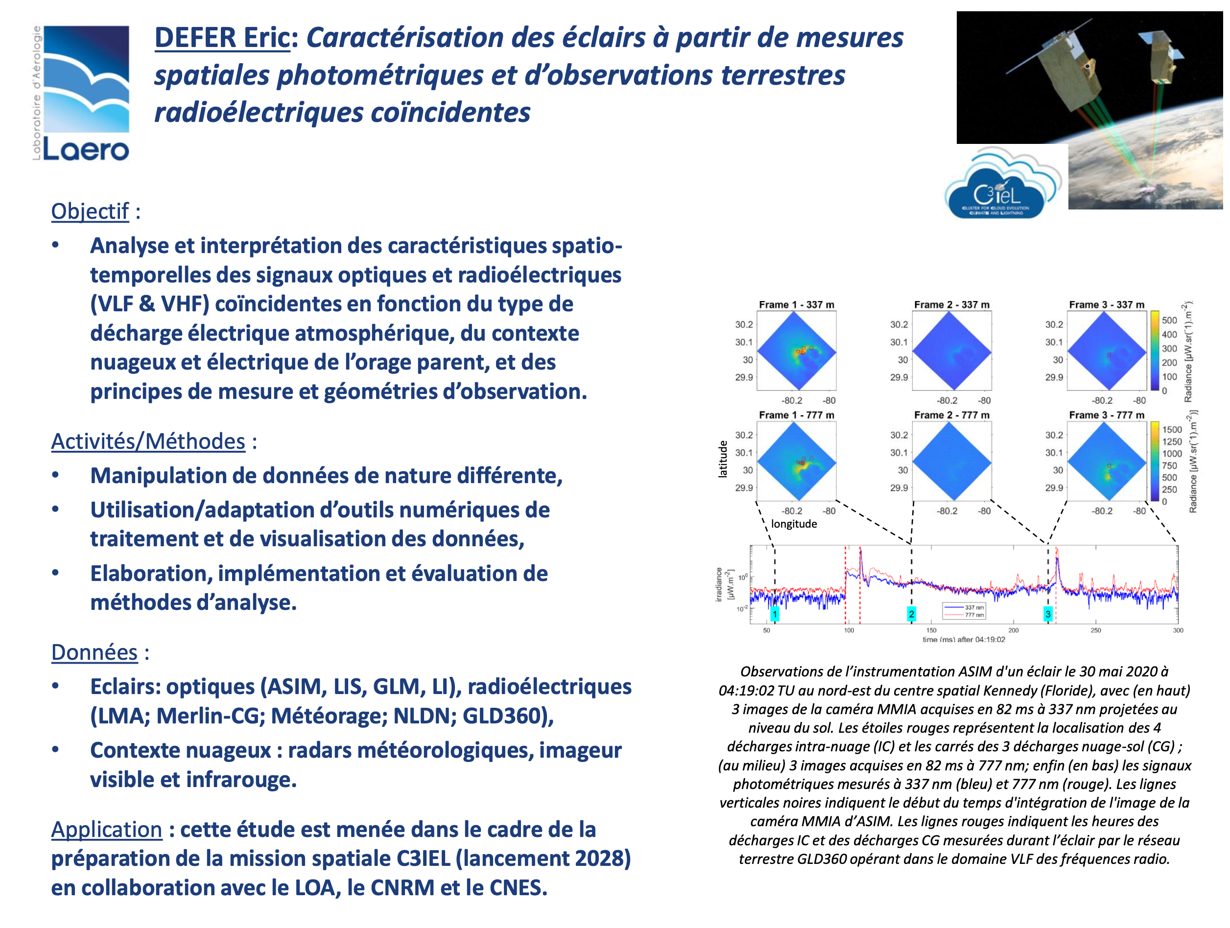 | Caractérisation des éclairs à partir de mesures spatiales photométriques et d’observations terrestres radioélectriques coïncidentes | Eric DEFER | MECANO | Pourvu |