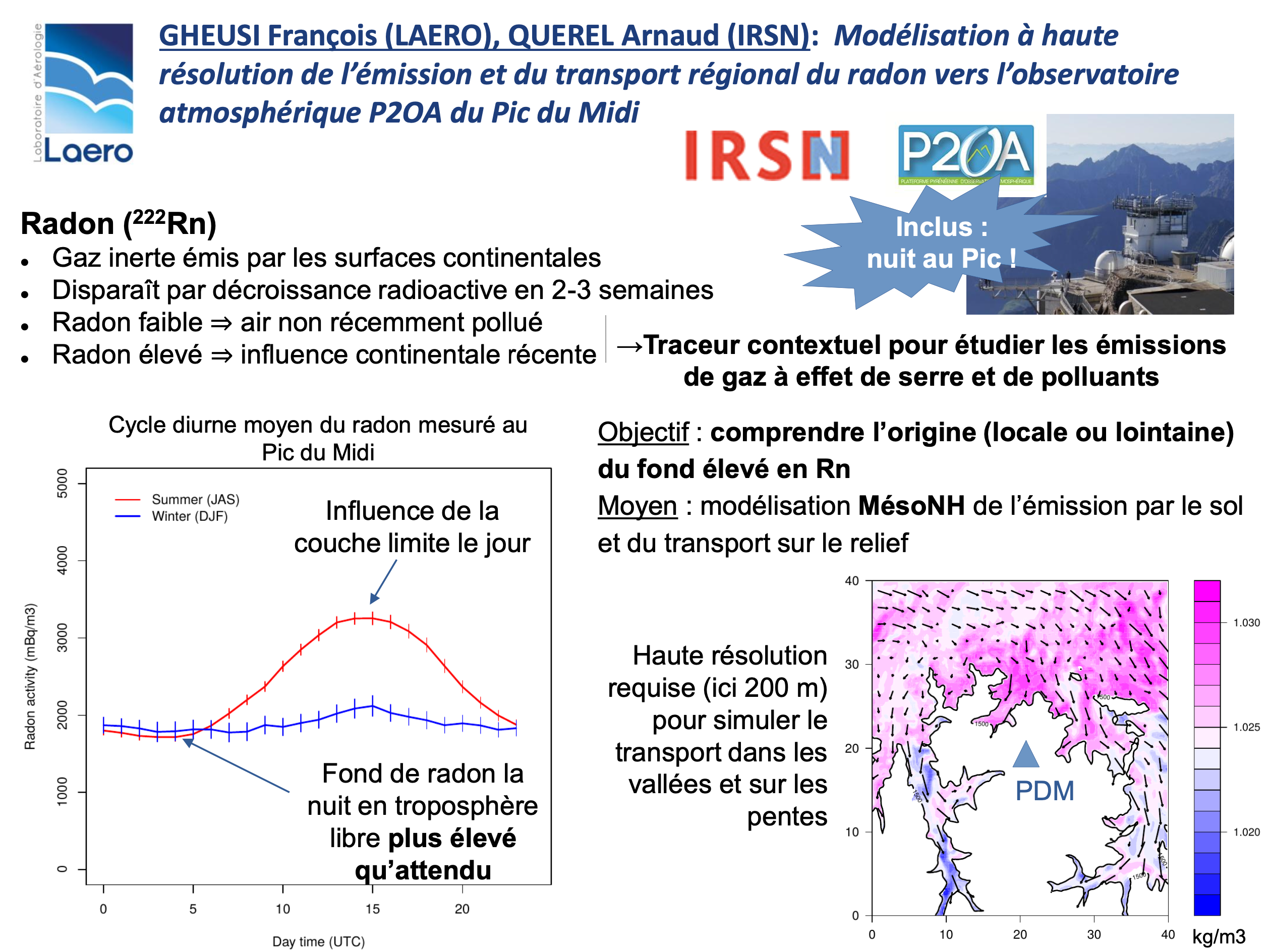| Modélisation à haute résolution de l’émission et du transport régional du Radon vers l’observatoire atmosphérique P2OA du Pic du Midi | François GHEUSI, Arnaud QUEREL (IRSN) | LEETCHIE | |