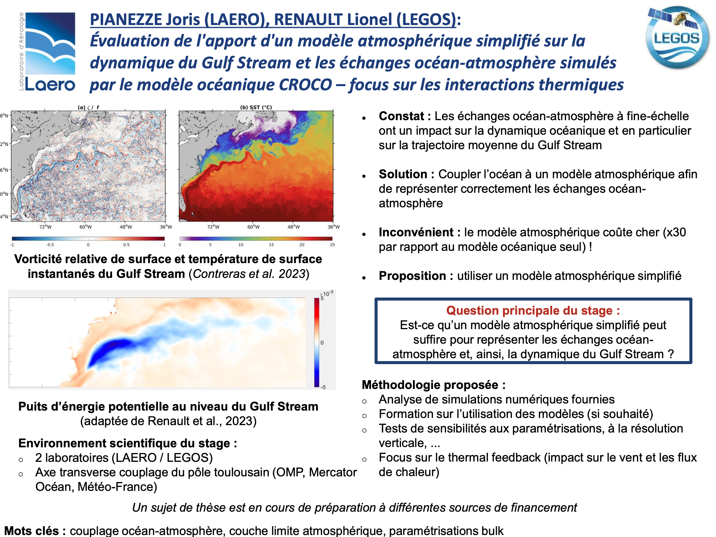 | Évaluation de l’apport d’un modèle atmosphérique simplifié sur la dynamique du Gulf Stream simulée par le modèle océanique CROCO – focus sur les interactions thermiques | Joris PIANEZZE & Lionel RENAULT (LEGOS) | MECANO | Pourvu |